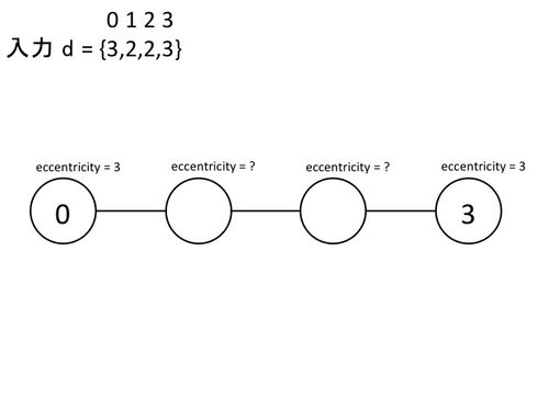 問題概要: 次の制約を満たすような木は存在するか?1. 木の頂点iのeccentricityがちょうどd[i]である.ここで、頂点iのeccentricityとは、頂点iから最も遠い頂点との距離のことである. 存在するのであればその木の辺集合を配列にして返すこと. 存在しないの…