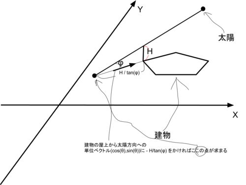 問題リンク : Walk under a Scorching Sun | Aizu Online Judge問題概要 : いくつかのの道と建物に加え太陽がある。 道、建物、太陽はそれぞれ線分、凸多角形+高さ、点として表される。道の上にあるある点xと太陽を結ぶ直線が建物と交差するなら、 その点xは…